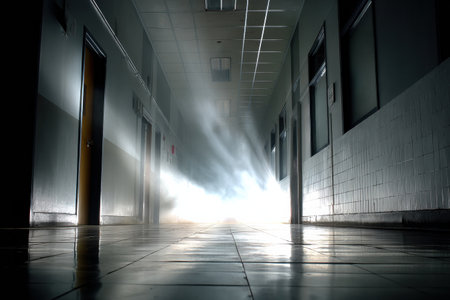 A hospital corridor stretches into the distance, fading into a mysterious smoke trail, evoking an unsettling yet intriguing ambiance.