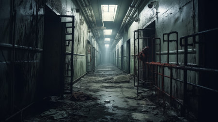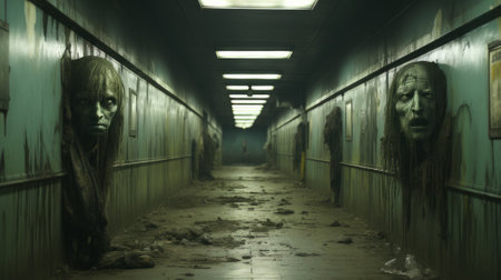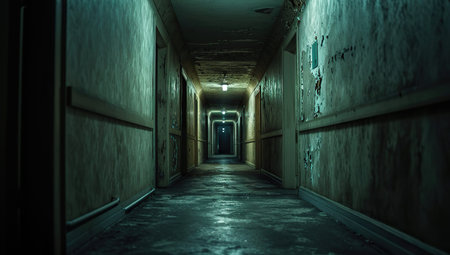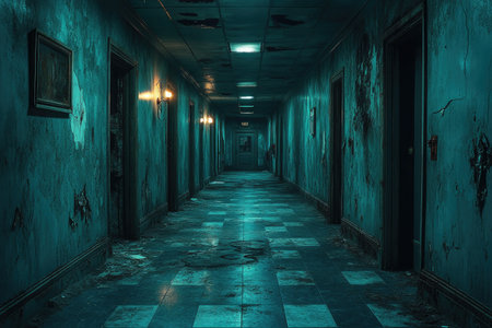 a horror-themed street photography image captures a long, creepy hallway at night. the photo is characterized by a dark teal and light orange color palette, reminiscent of the vancouver school art style. it exudes a sense of darkness and mystery, with elements of farm security administration aesthetics. the image features a combination of dark green and beige tones, along with medical themes, all presented in