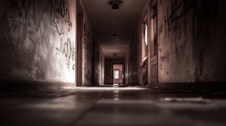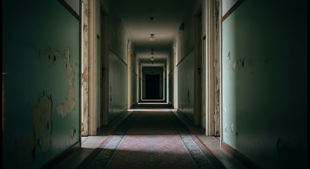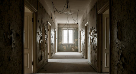 Dark Abandoned Hallway with Peeling Walls and Long Perspective