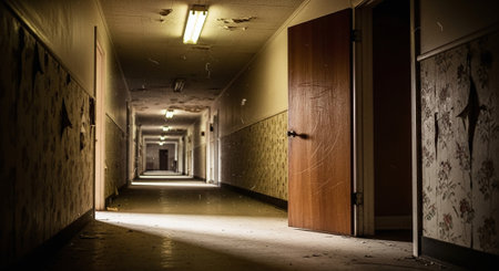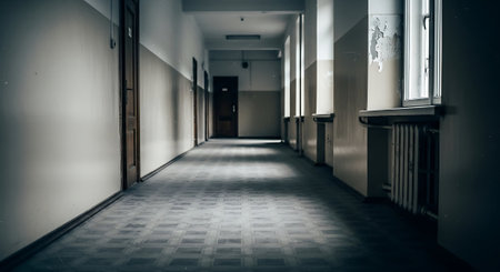 An interior shot features a long, dimly lit hallway with an open door at the end. The scene reveals architectural details of an old building, including windows and tiled walls. The lighting creates a contrast of shadow and light, and the composition suggests a sense of mystery. Suitable for various editorial and commercial applications.