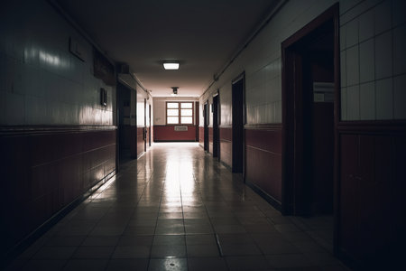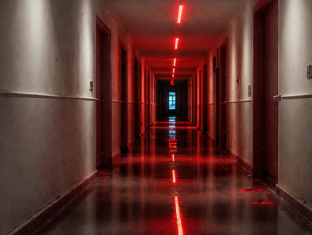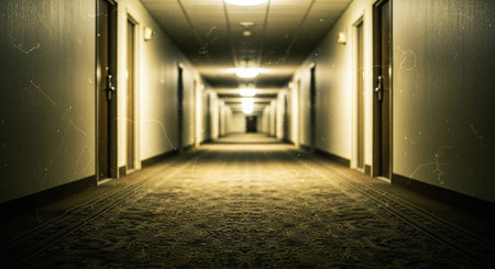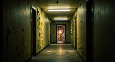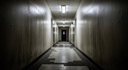 A dark hallway illuminated by a warm glow at the end, evoking a sense of mystery and tension. The empty corridor invites exploration and contemplation.