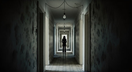 A dark shadow stands in a dimly lit hallway creating an eerie atmosphere