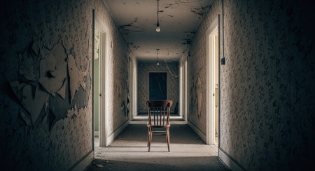 An empty, dimly lit hallway with peeling wallpaper and a single wooden chair in the center
