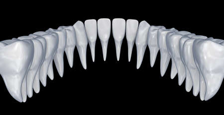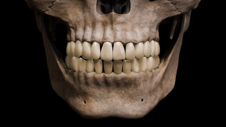 Anterior or front close-up of human mouth, jaw, skull and teeth isolated on black background 3D rendering illustration. Anatomy, medicine, biology, science concept.