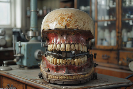 An antique dental skull model with visible teeth on a wooden table in a vintage laboratory setting.