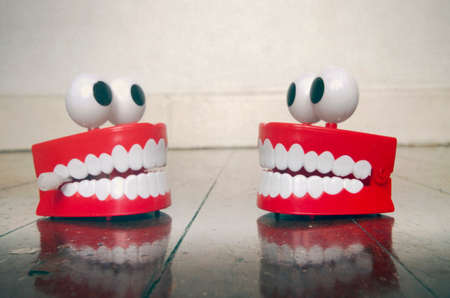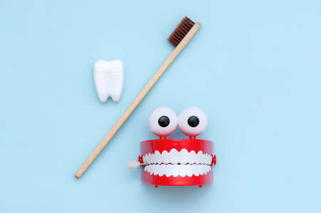 Funny toy clockwork jumping teeth with eyes holding razor on blue background.