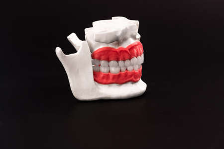Close up of plastic jaw model with teeth in dental clinic. Dentistry concept.