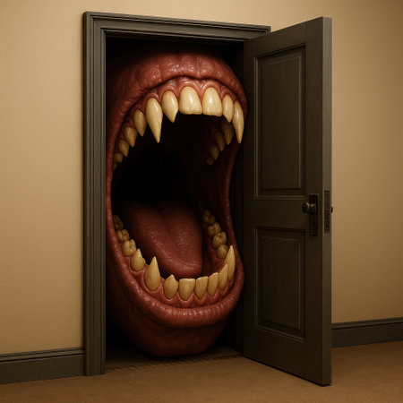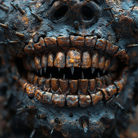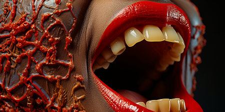 A surreal close-up of teeth lodged in a fleshy, organic structure, evoking themes of horror and discomfort. Ideal for dark art, Halloween, or unsettling visuals in creative media.