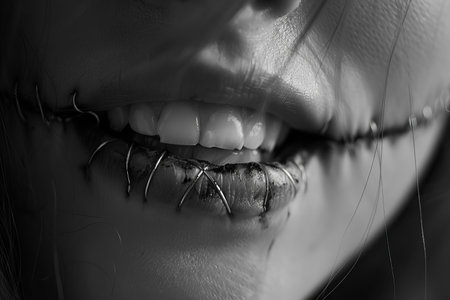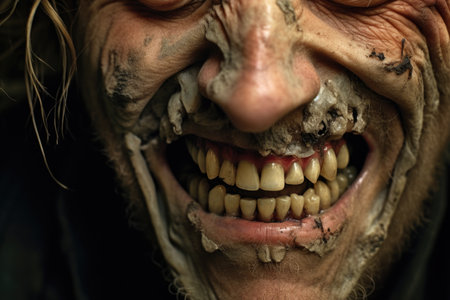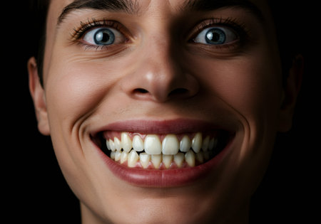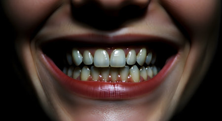 A hauntingly intimate shot captures a faint, enigmatic grin in shadowed dimness, where jagged teeth and exposed gums evoke unease and intrigue through stark contrast.