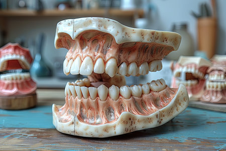 Close-up of a dental model showing detailed teeth and gum anatomy, set on a wooden table in a dental office environment. Other dental models are blurred in the background, emphasizing the primary model's realistic texture and structure.