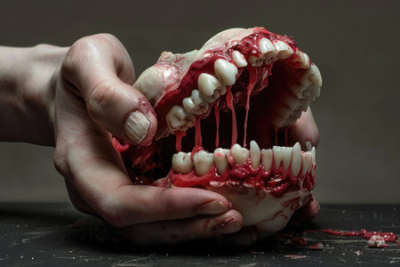 A hand holds a bloody jaw, revealing rows of teeth and dripping with red liquid.