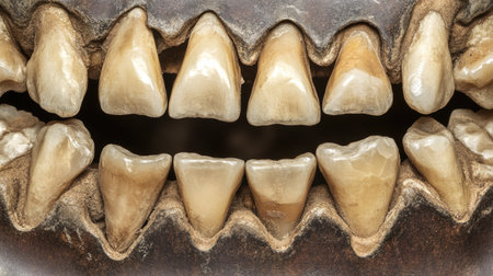 This image showcases a detailed close-up of an animal jawbone featuring a unique arrangement of teeth, highlighting the natural texture and anatomical features.