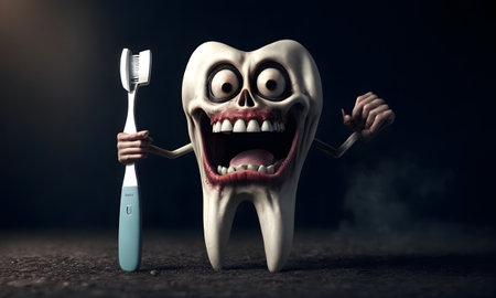 A happy tooth is holding a toothbrush in its arms and legs, ready to smile bright in the darkness. Its like a fictional character brought to life in an artful gesture