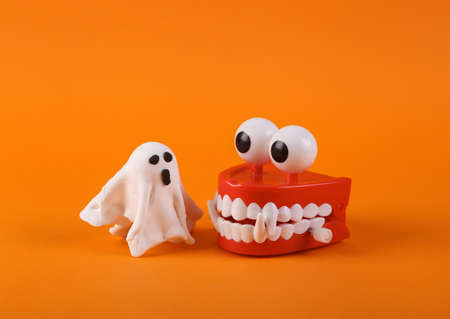 Halloween scene Fanged monster chasing marshmallows with faces on orange background.