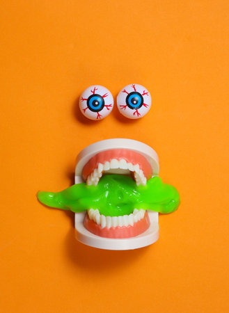 Eyeballs with jaw and slime on orange background. Halloween still life