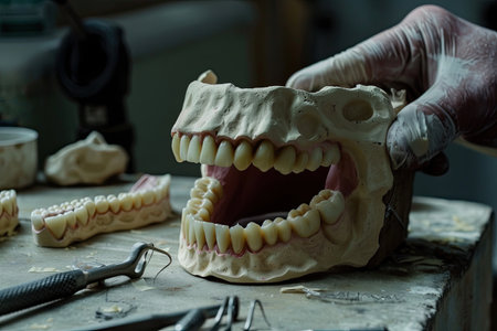 A dentist is meticulously working in a dental lab, carefully handling a realistic dental model on a workbench. Surrounding tools and other dental models highlight the precision involved in creating lifelike teeth. The setting represents a dedicated workspace for dental professionals.