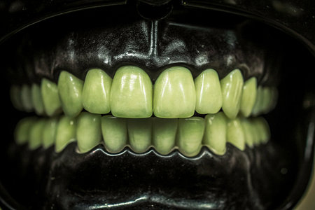 Close up of green artificial teeth for dental prosthetics. Toned.