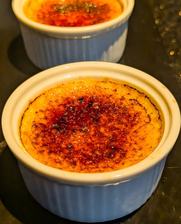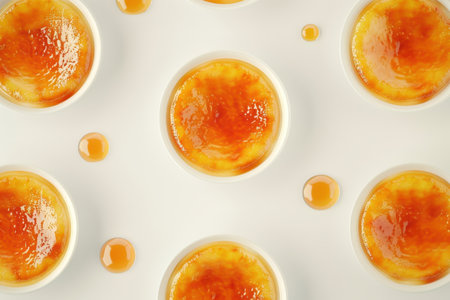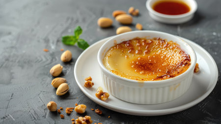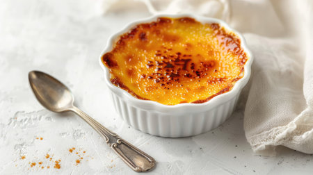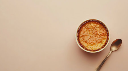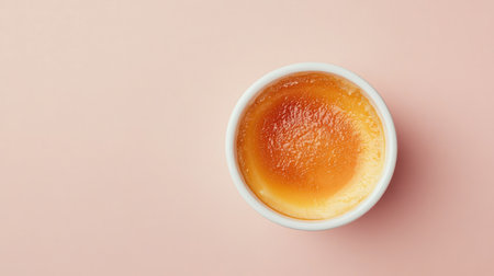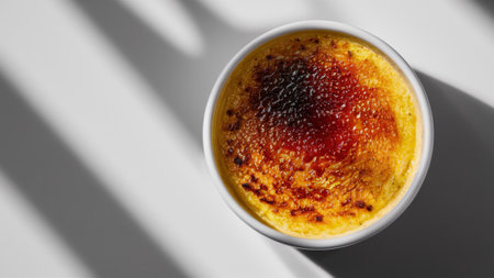 Top view of cr in a white ramekin with a glossy caramel top, surrounded by a simple background. Ideal for minimalist dessert-themed designs.