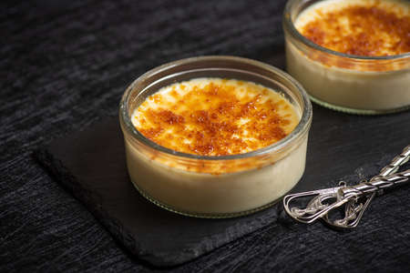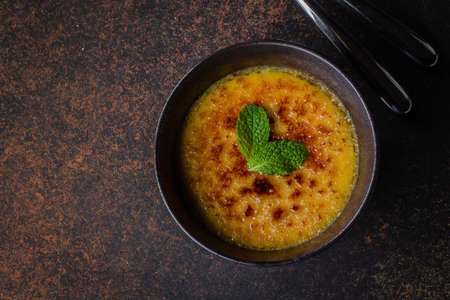 Bowl or Cup of creme brulee with dessert plug and mint leave on dark stone table background, top view, copy space. French food dessert