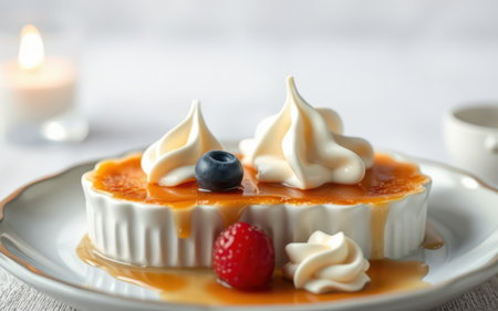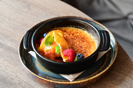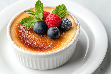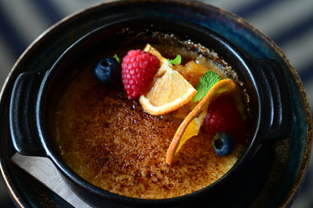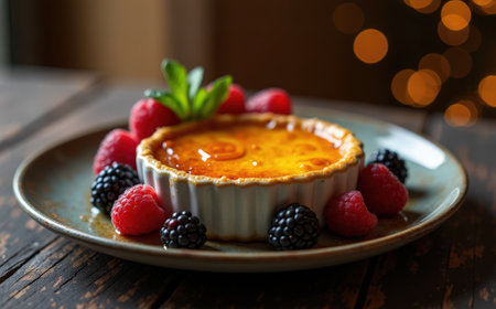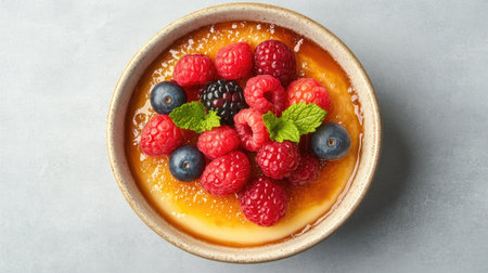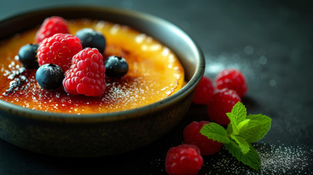 Close-up a creme brulee dish, presented with a topping of fresh berries, adding color and flavor to the dish