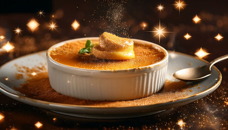 A close-up view of a perfectly prepared creme brulee in a white ramekin, presented on a dark plate. The dessert a glistening, caramelized sugar crust with a delicate golden hue. A small mint leaf and a piece of biscuit garnish the Edible glitter sparkles across the surface and around the dish, creating a magical and festive atmosphere. A golden spoon rests on the side of the plate, ready for a taste of this rich and creamy indulgence.