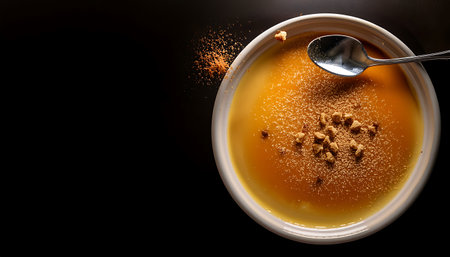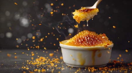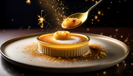 Into showing decadent creme brulee dessert with golden sparkles and spoonful being lifted keywords: creme brulee, dessert, sweet, food, gourmet, luxury, rich, creamy, custard, caramel, sugar, spoon, golden, sparkle, glitter, dust, powder, dark background, bokeh, celebration, indulgence, delicious, treat, restaurant, fine dining, presentation, rich color, amber, yellow, brown, dessert topping, culinary, baked, baked goods, sweet treat, dessert course, dessert time, dessert recipe, dessert...