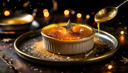 Close-up of a golden caramel cr?me br?l?e dessert topped with a star anise garnish and being drizzled with a thick syrup from a spoon. The glossy texture of the custard and syrup contrasts with the dark bokeh background, highlighting the rich colors and festive ambiance.