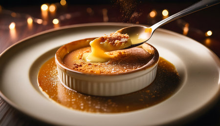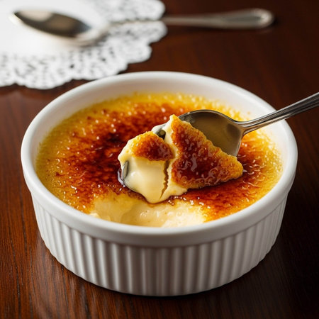 Close up shows creme brulee dessert with a spoon, a sweet treat ready to be enjoyed in a restaurant or cafe.