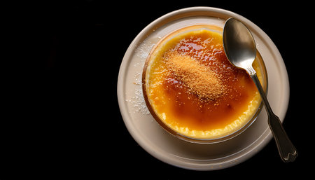 An overhead view of a white ramekin filled with a golden creme brulee, its caramelized sugar crust lightly sprinkled with fine, light brown crumble. A silver spoon rests across the of the dessert. The ramekin sits on a light pink, textured circular base. The entire composition is set against a stark black background, creating a dramatic contrast and focusing all attention on the dessert.