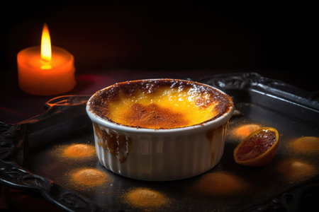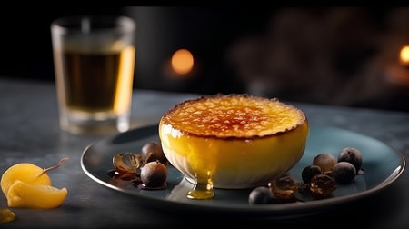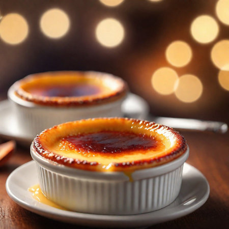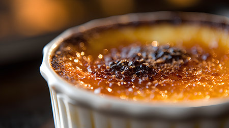 Close up of a Creme Brulee, foreground sharp with bokeh background. ai generative