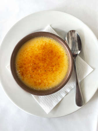 Creme brulee with caramelized sugar in a white ceramic bowl