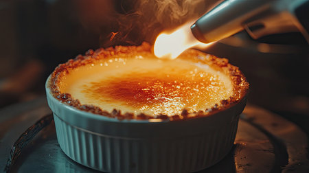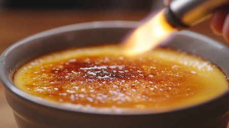 A classic in a ramekin being with a blowtorch, sugar caramelizing to a golden brown. Vanilla beans add an aromatic touch, perfect for culinary visuals.