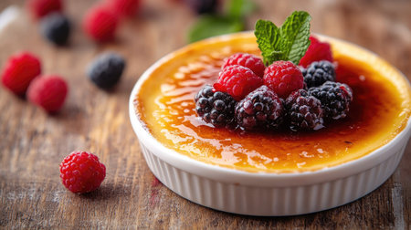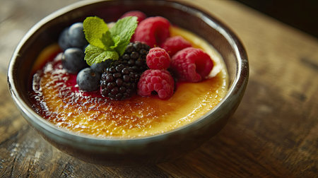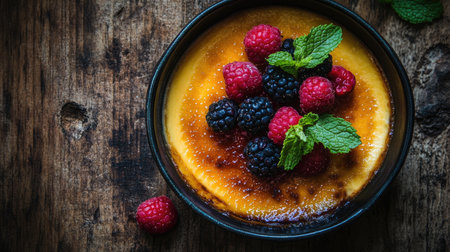 A rich with a caramelized top, adorned with mixed berries and mint, captured in close-up on a weathered wooden table. Perfect for enticing dessert images.