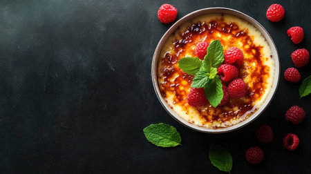 Mouthwatering creme brulee topped with fresh raspberries and a mint leaf, served on a dark plate