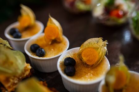Vertical shot of a dessert table with creme brulee in ceramic cups and fruit berries