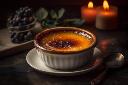 French Creme Brulee, Caramelized Custard Dessert, Burnt Pudding, Creme Brulee in White Bowl, Abstract Generative AI Illustration