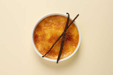 Delicious creme brulee with vanilla sticks on beige background, top view