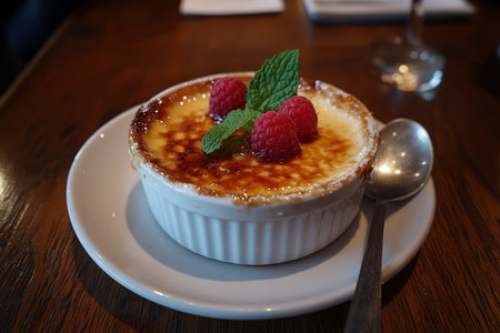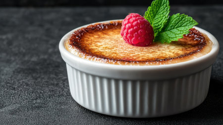 Close-up of a creamy creme brulee dessert with raspberry and mint garnish