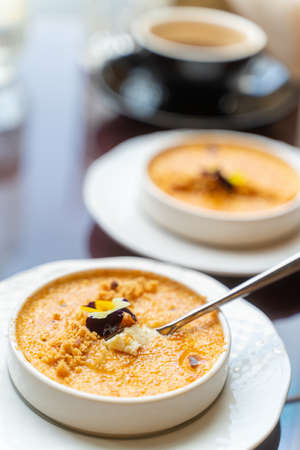 Spoon in creme brulee dessert served with coffee in cafe. Natural light, vertical, selective focus