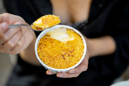 Woman eating dessert with creme brulee at the restaurant outdoors, close-up on dessert. Concept of italian cuisine