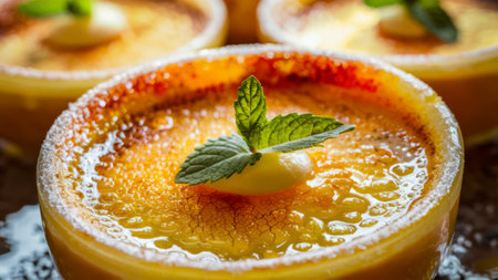 Classic french dessert crème brûlée with mint garnish for culinary presentation