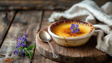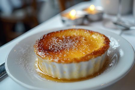 A luxurious French dessert showcasing creamy custard texture and glossy caramel crust, perfect for restaurant menus and fine dining promotions.