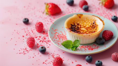 Creme brulee dessert served with raspberries and blueberries on pastel background