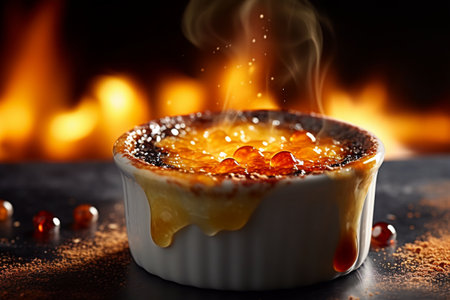 Top view of cr being capturing the vibrant flames caramelizing the sugar in a ramekin. The addition of vanilla beans provides a touch of elegance.