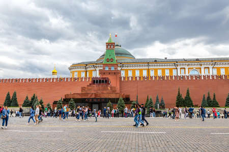 Moscow, Russia - July 7, 2019: People walking along the Red Square next the Lenin Mausoleum and the Moscow Kremlin