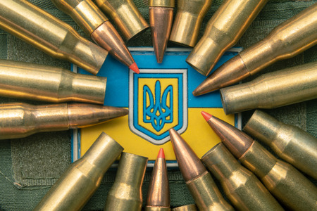 Patch with the flag and coat of arms of Ukraine, rifle cartridges on a camouflage background.