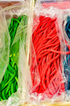 Closeup of shop box with many colorful jelly worms, long gummy candies. Sugar food.