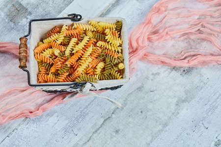 Italian pasta, three color from durum wheat with vegetables on the kitchen textiles, background, selective focus. for use as background image or as texture