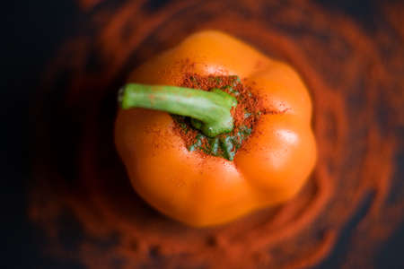 Fresh red bell pepper and slice on black background. Top view Tropical abstract background. Cloe up Pepper vegetaibles with drops of water.