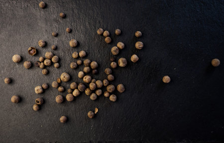 Black pepper closeup on luxury stone background as flat lay, dry food spices and recipe ingredients